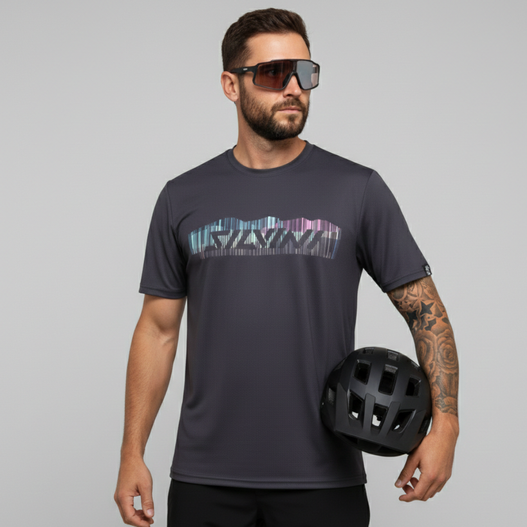 Men’s Denno short-sleeve jersey made from lightweight, breathable Light MESH with a loose fit and slightly extended back, providing comfort and style for cycling and leisure.