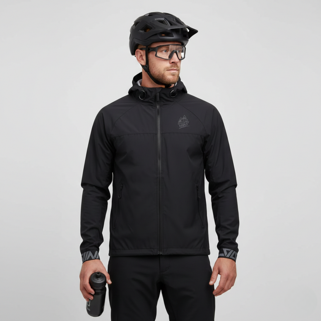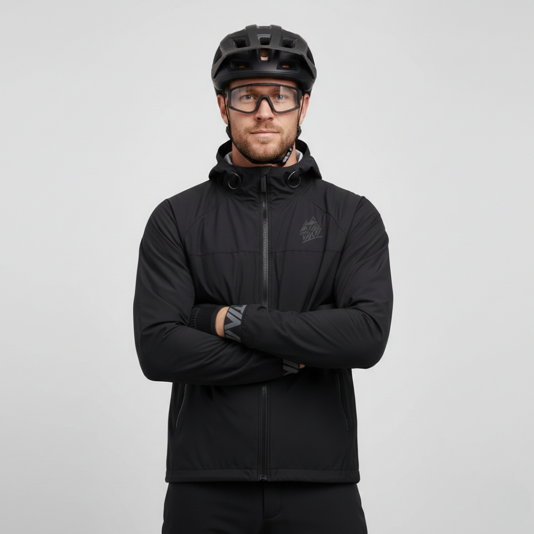 Men's jacket suitable for enduro. Made from a combination of materials, including a Quatroflex Power membrane and a lightweight Windbreaker. The jacket has a hood and zipped pockets. Safety reflective elements are also included.