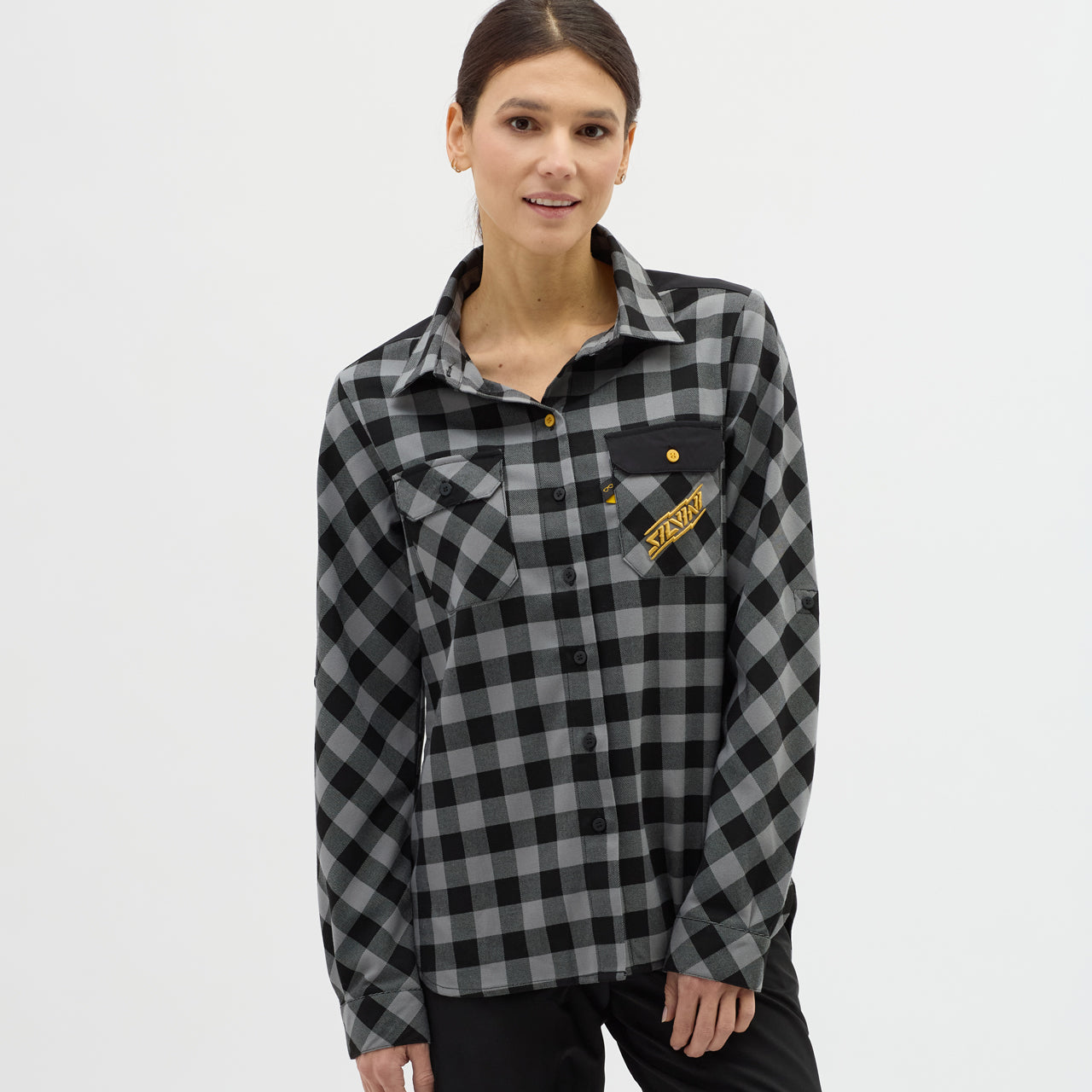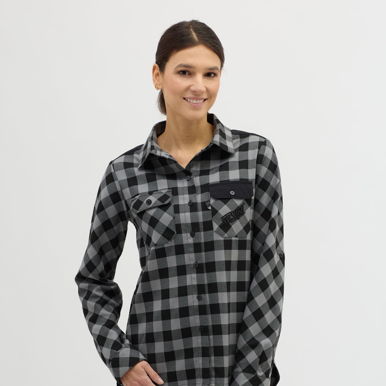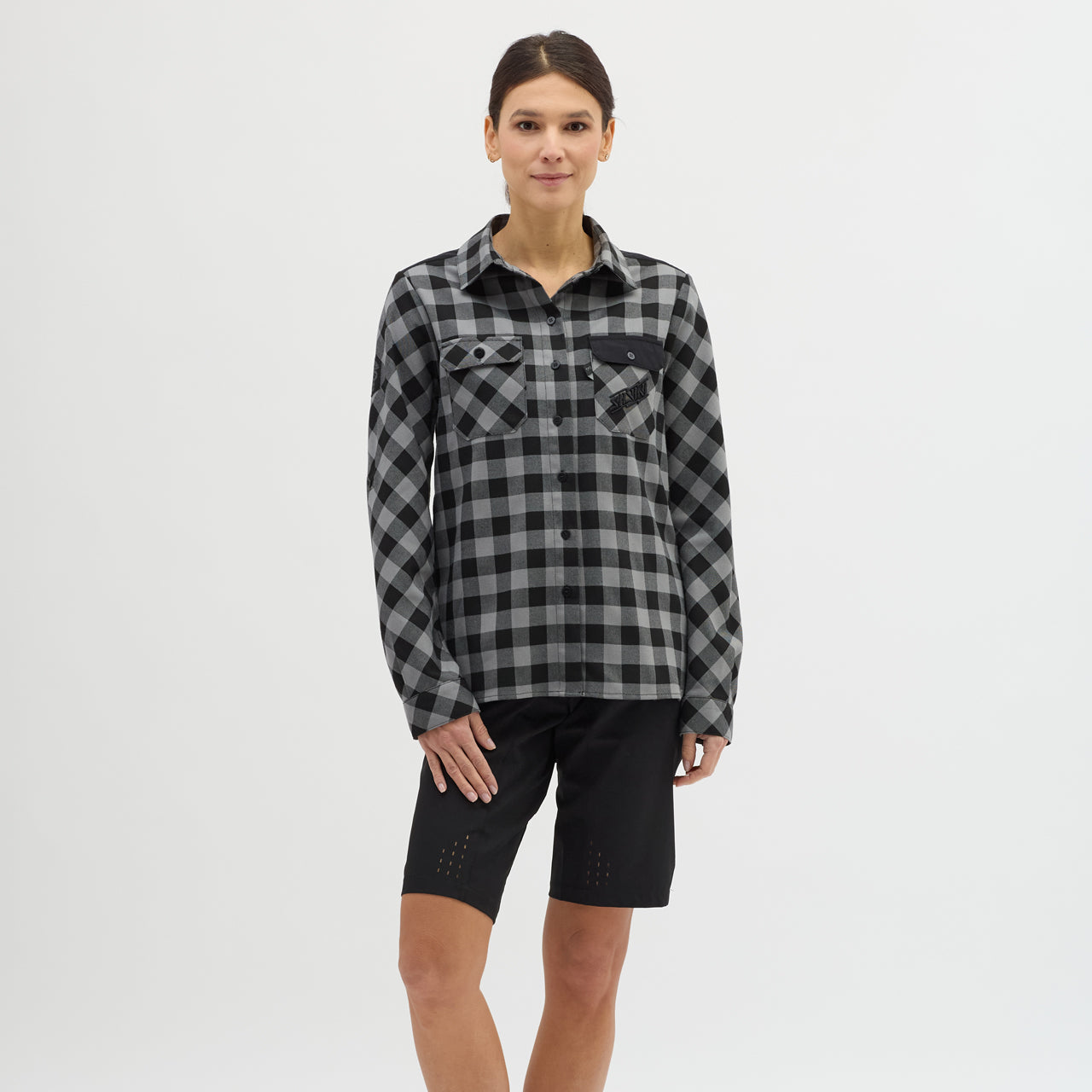 Women's breathable flannel shirt for enduro riders and leisure. It can be worn alone or as a second layer over a T-shirt. It has two chest flaps and a button to fasten the rolled up sleeves.