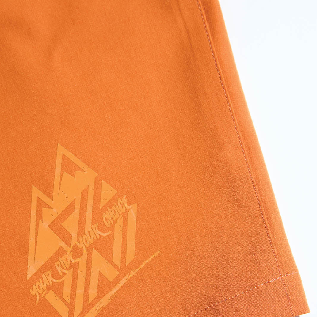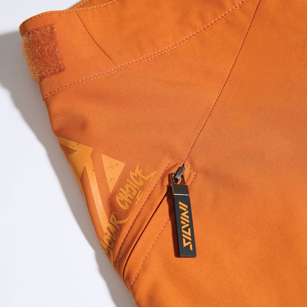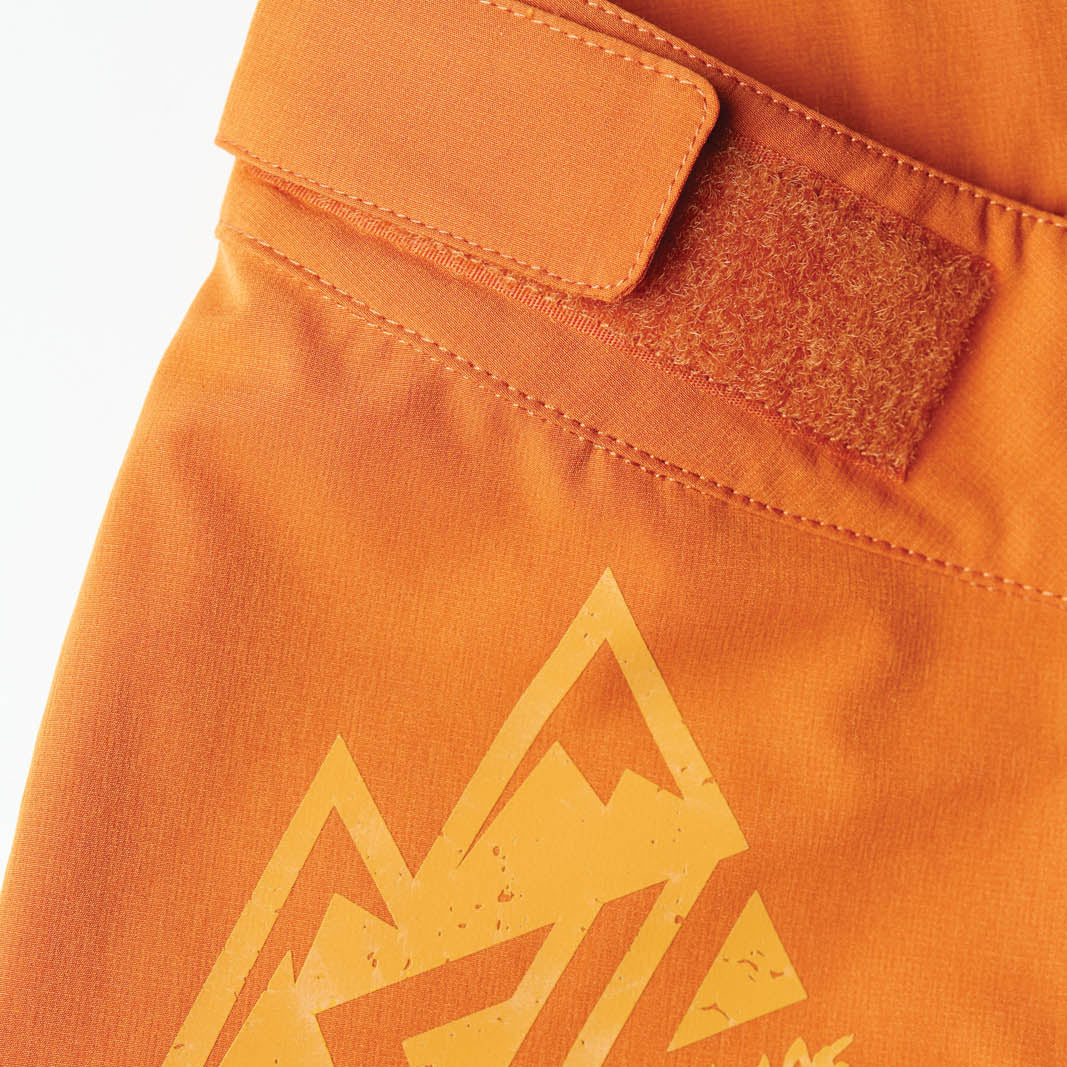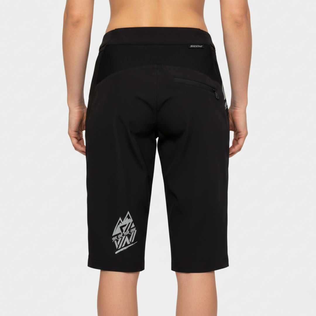Women's enduro shorts made of flexible and breathable Woven stretch material. The cut of the shorts is loose and the back is raised. There is a velcro fastening at the waist and two zipped pockets on the sides.