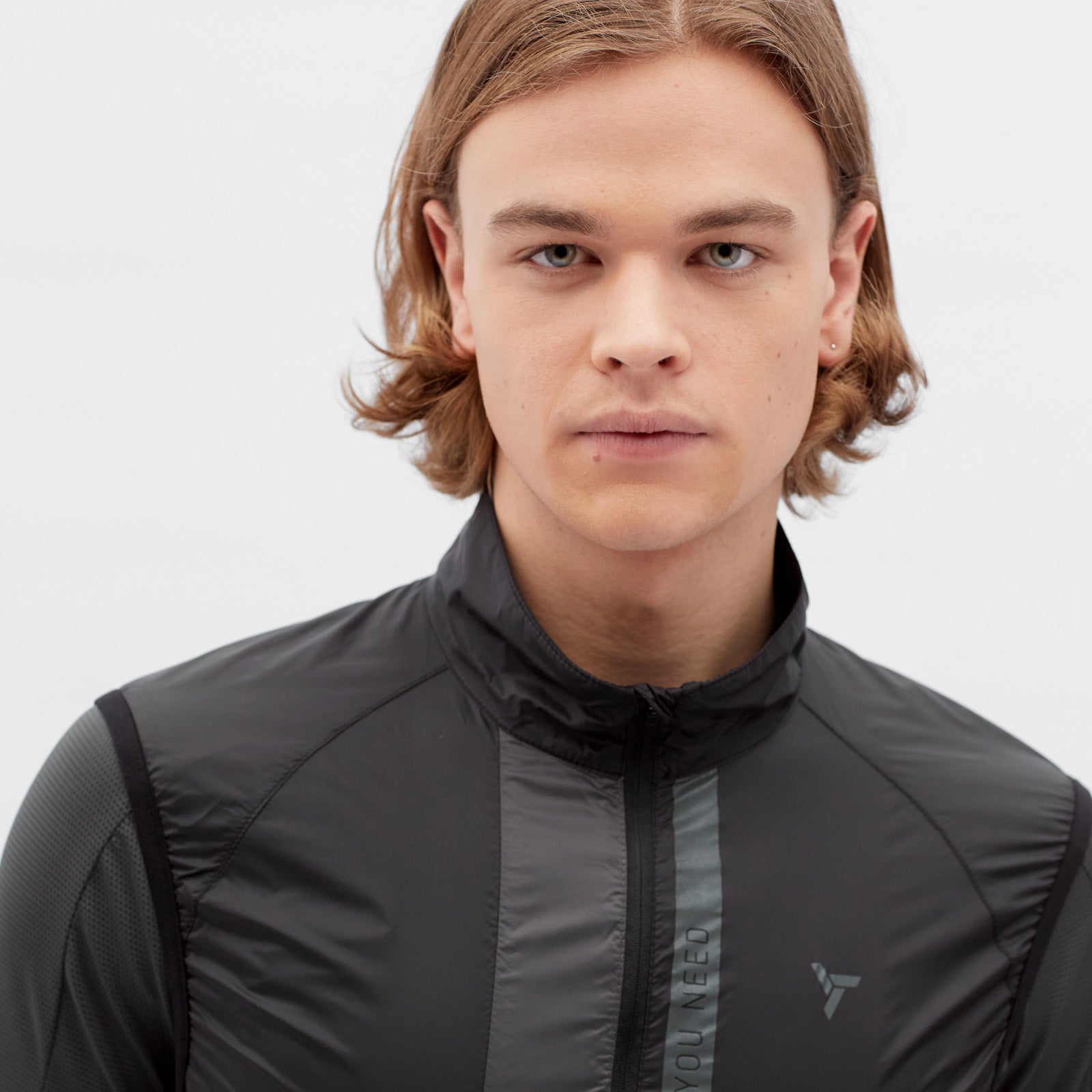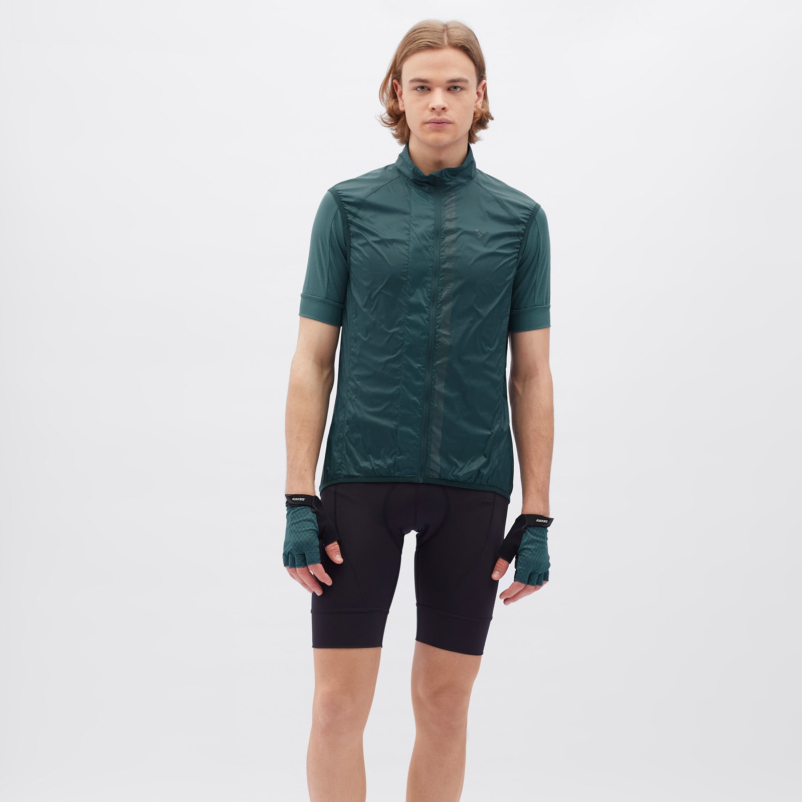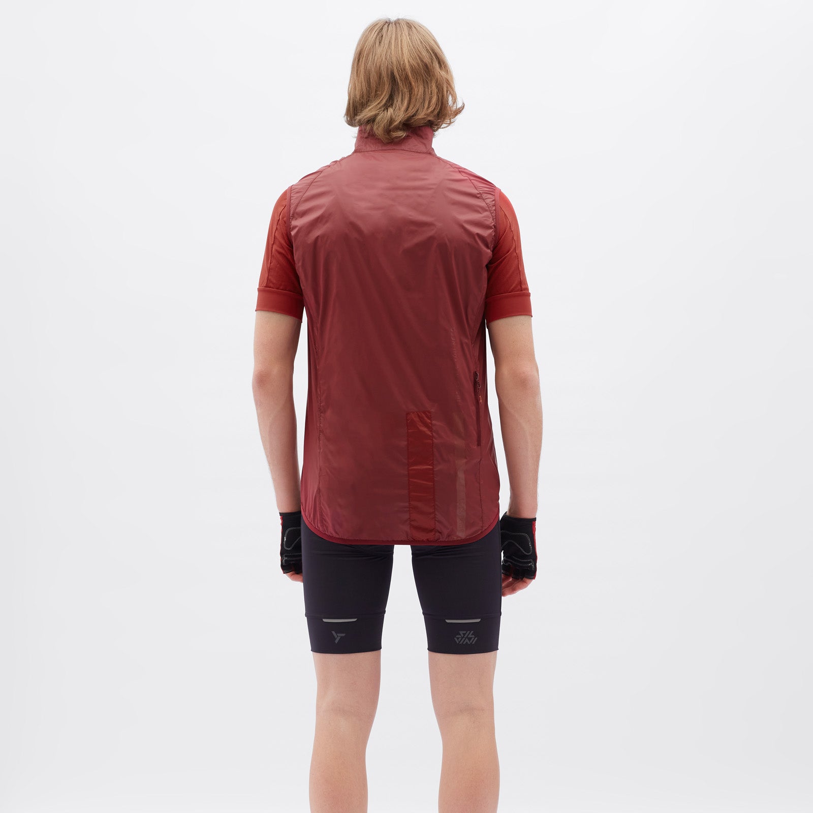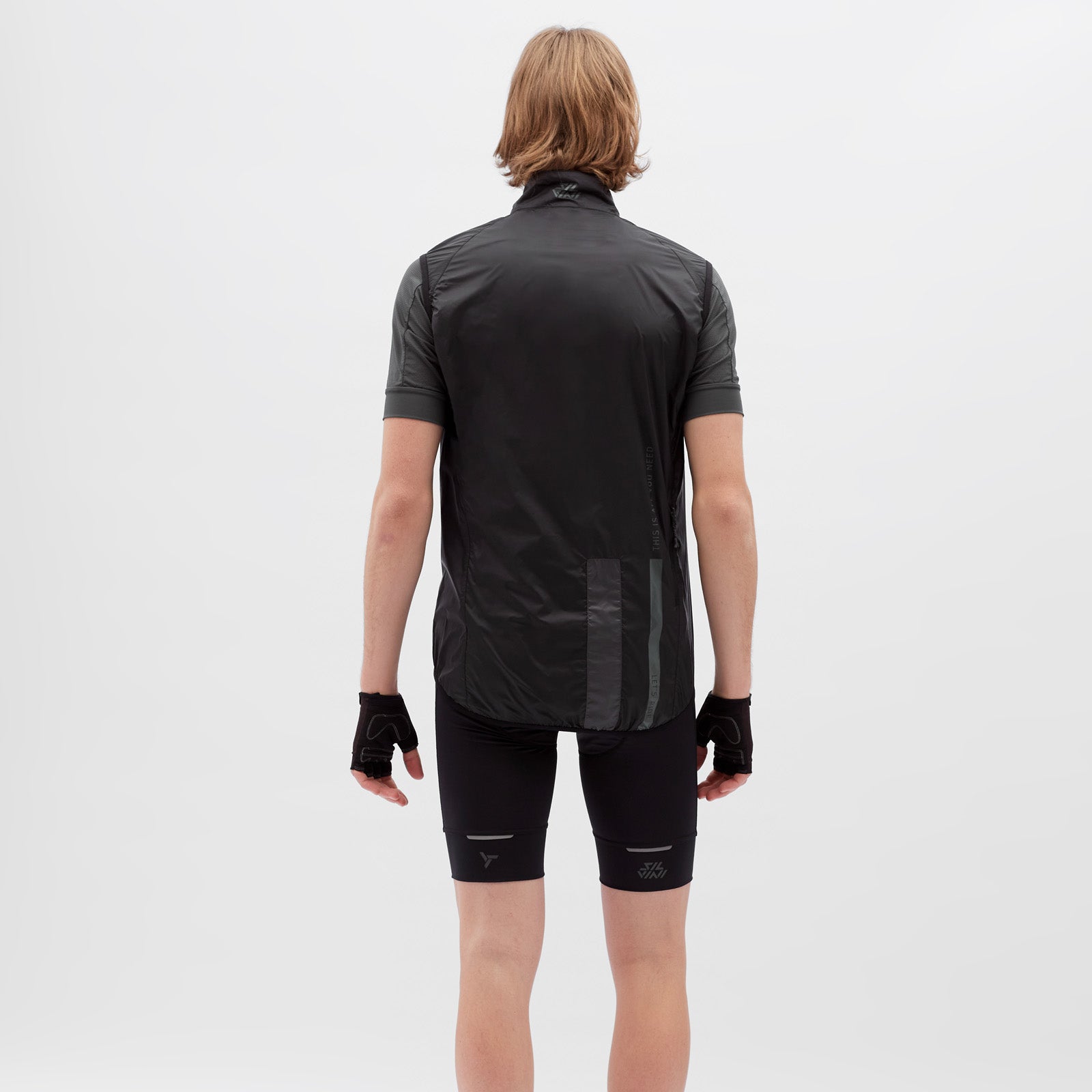 The men's cycling vest is made of windproof, light and densely woven material. It packs down easily and has an extended back section with a vertical zip pocket. The vest includes reflective elements.