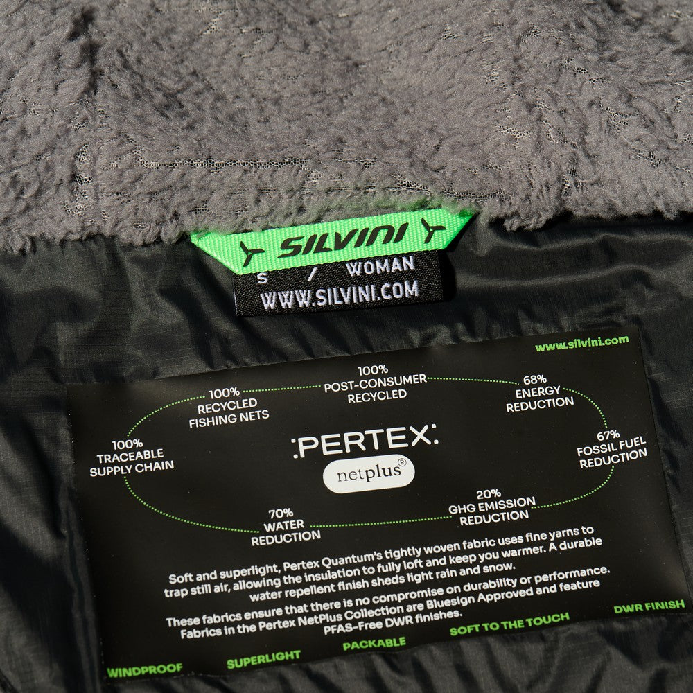 The Sassolunga women's jacket is lightweight, warm, and windproof, made from recycled materials, ideal for ski touring and outdoor activities in cold conditions.